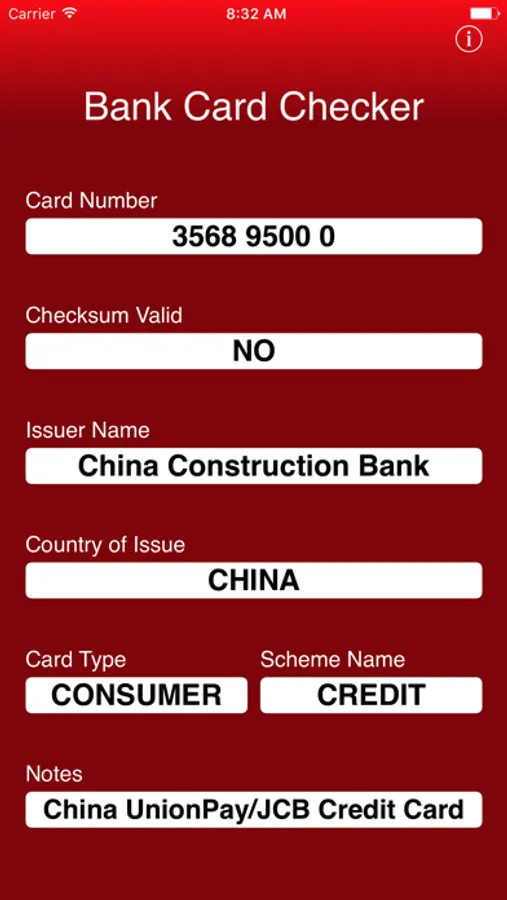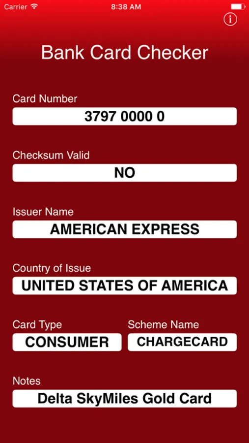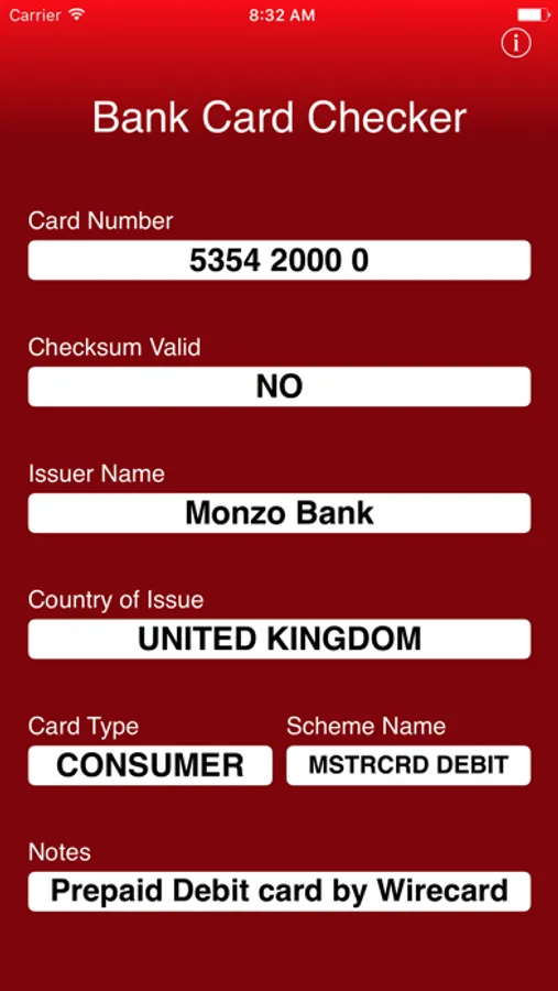 This incredibly easy to use application lets you view Credit or Debit Card Issuer data on your iPhone as well as validating the card number. The App interrogates its internal database of Card Issuer data to tell you the name of the bank or financial institution, the country the card was issued in, whether the card is a consumer or corporate account and the scheme type (VISA Credit, VISA Debit, Mastercard Credit, Maestro etc) .