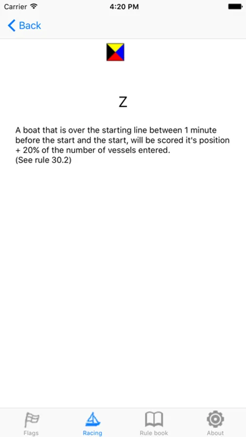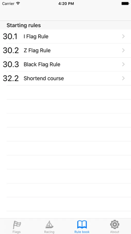 The "Rule book" section has quotes from ISAF's "Racing Rules of Sailing 2009-2012" that relate to the flags for the start procedure and the shortened course.