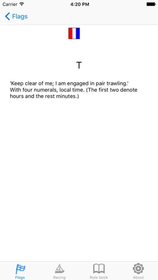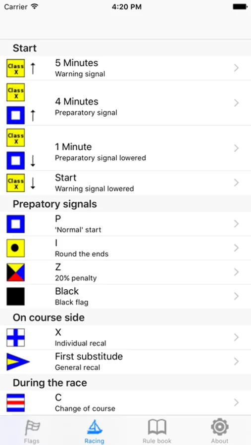 A separate section describes how the flags are use in sailing regattas. You can see how the race committee signals the starting procedure, early starts, postponements and race abandonment.