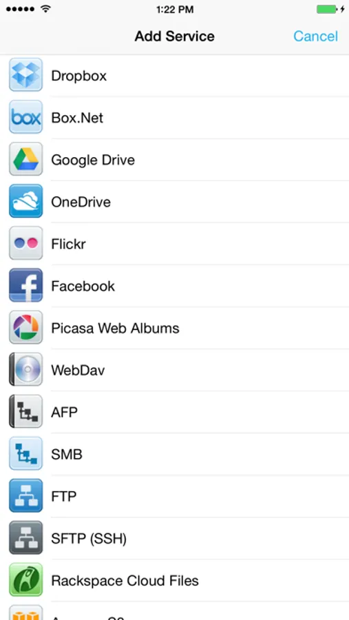 Dropbox, Google Drive, iCloud, Box.net, SkyDrive, SugarSync, AFP (Mac Shares), FTP/FTPS, SFTP, Flickr, Picasa, Facebook, Rackspace CloudFiles, CloudApp, PogoPlug, WebDav, Amazon S3, Ubuntu One Files, ownCloud, 4Shared, also using Amazon S3: DreamObjects and UltiCloud.