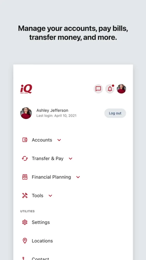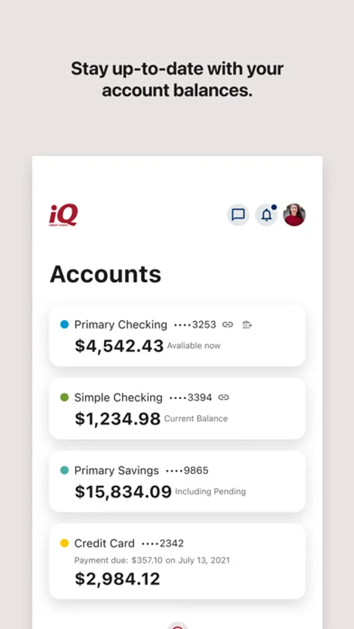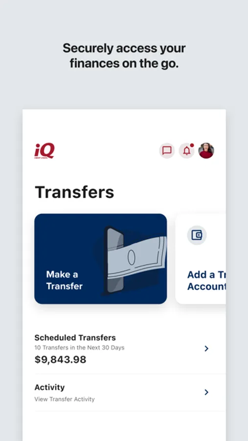 iQmobile banking allows you to check balances, view transaction history, transfer funds, and pay bills on the go!
