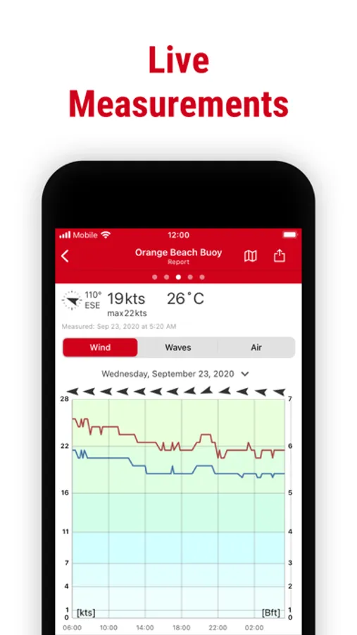 + Measurements listed in knots, Beaufort, mph, km/h and m/s