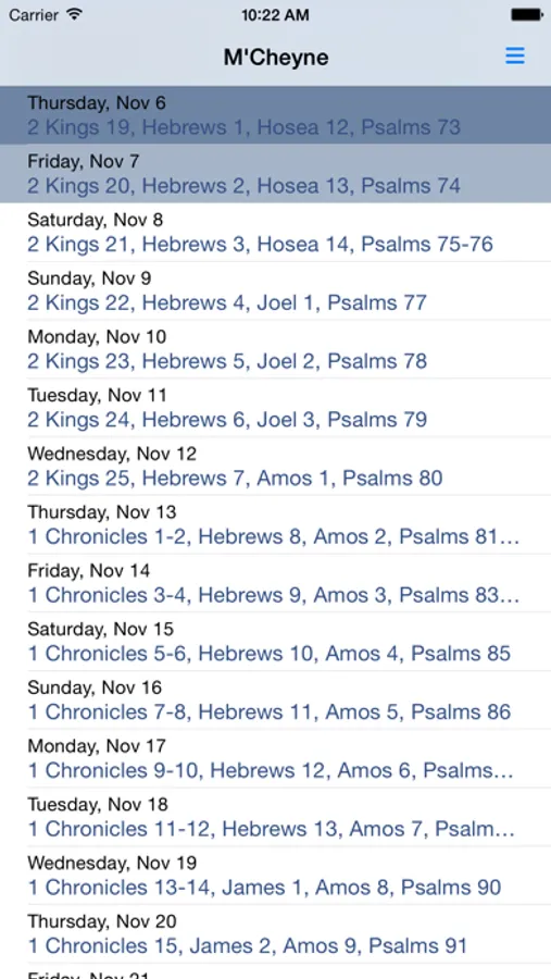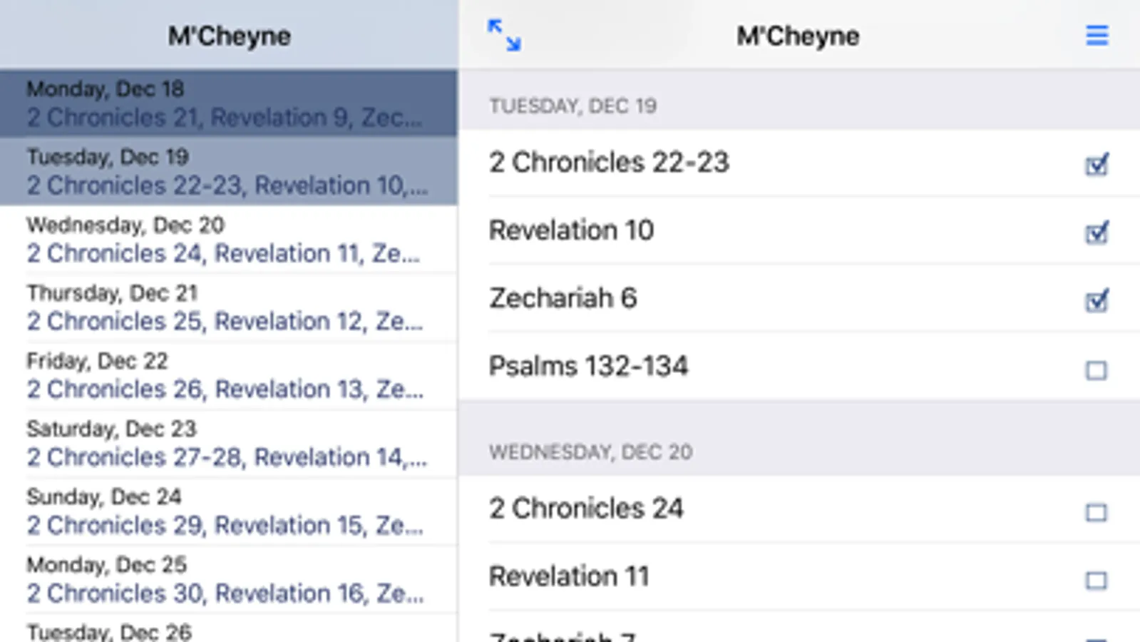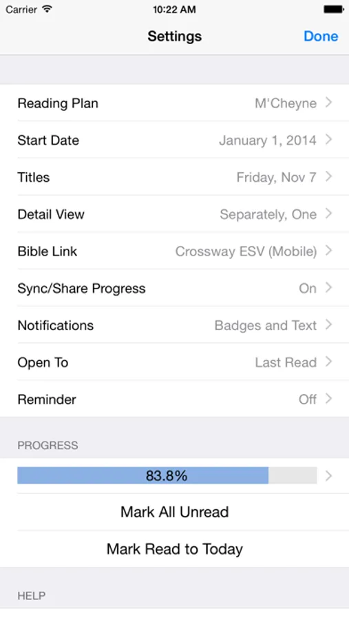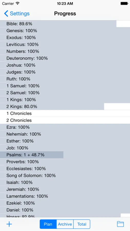ReadingPlan helps you track your progress as you read through the Bible. You can start a plan at any time, progressing at your own rate or on the schedule dictated by the plan. You can optionally link to an online bible site to see the day's readings in the application's built-in web view, or launch a native bible app (if supported.) Five plans are installed by default; many more are available for download from within the app, or you can create your own.