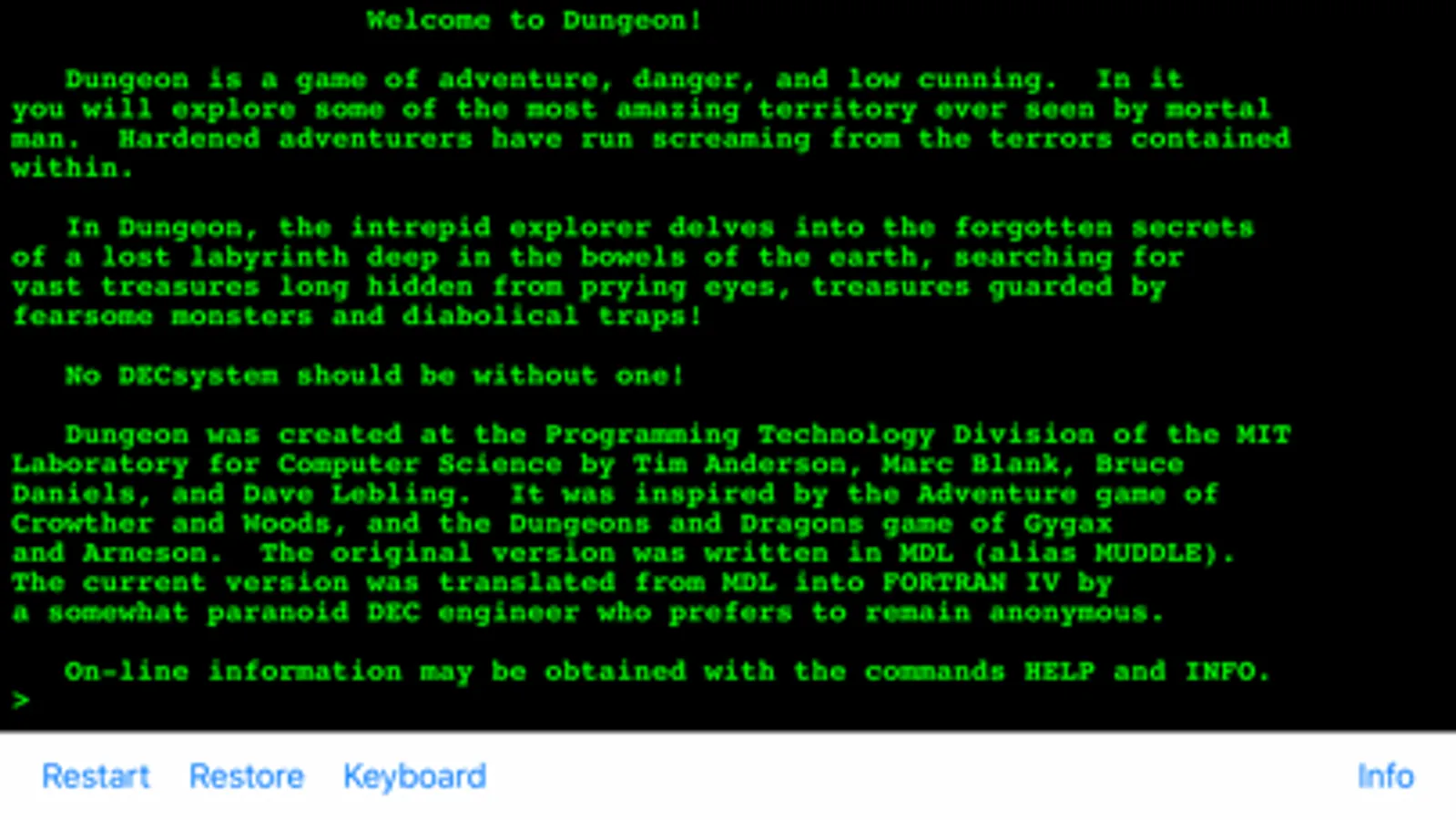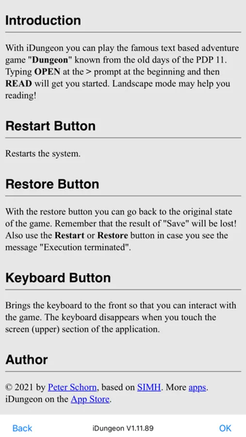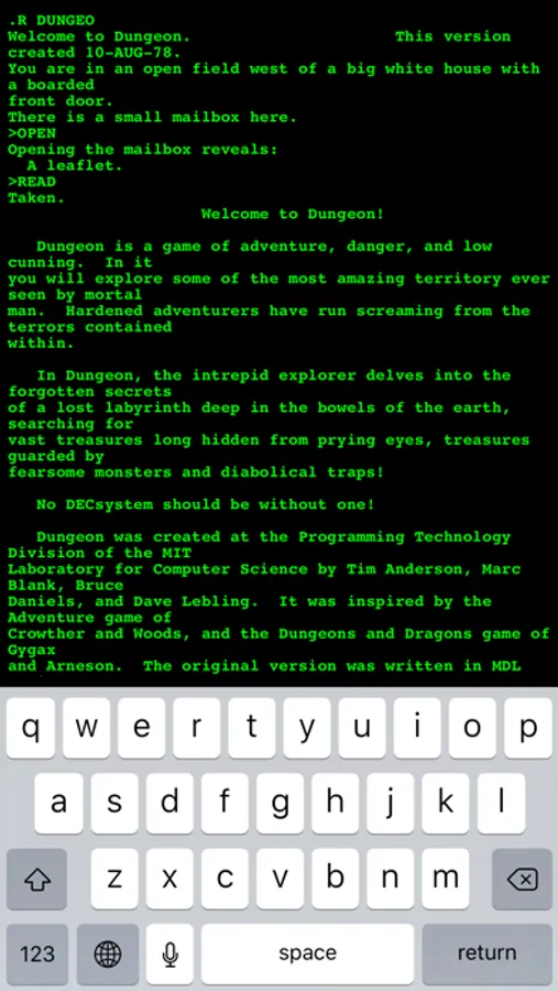 iDungeon allows you to play the more than 40 years old text based adventure game «Dungeon» that was once popular on the PDP 11 and similar systems. The game is running on a stripped down version of the RT11 operating system.