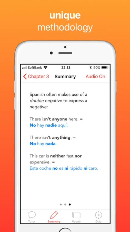 Unlike most other Spanish language apps which just have lists of vocabulary or flashcards, this app actually teaches you the basics of Spanish — grammar, pronunciation, vocabulary, and the usage of words — using an effective and clear methodology which you will thoroughly enjoy! There is simply no better way of learning Spanish!