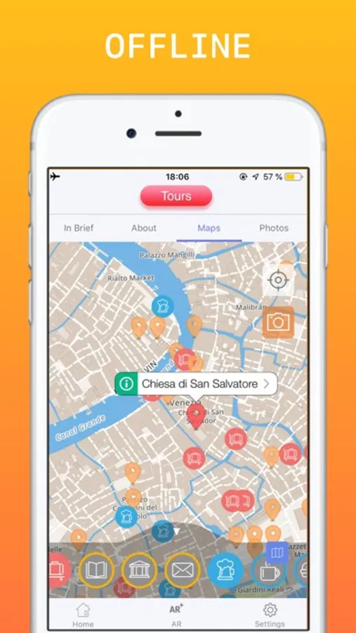 AUGMENTED REALITY, unlike other tourist guides you will be able to discover the city with the best iPhone tool - AR - Just click on the AR button, turn yourself 360° and view on the screen where the best spots are and how to find them. You can also scroll up and down to view the closest and furthest attraction. Slide through the tutorial for more tips.