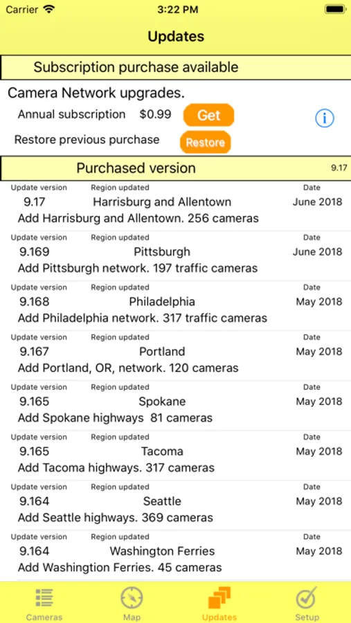 The camera network periodically adds more cameras. These additions require an update to the app. With an annual subscription you will receive updated versions whenever the network expands.