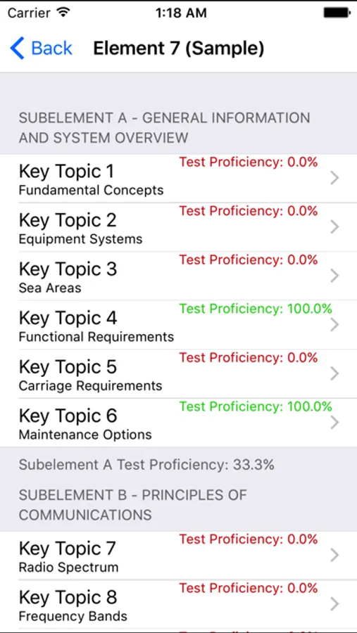 After completing your first practice exam, the question pool screen will display your proficiency in each question subelement/topic for all practice exams you have completed. This will help you determine what areas need further study!