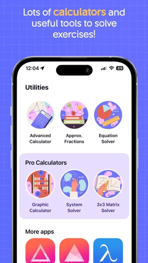 • Advanced Calculators: Access the graphic calculator, system solver, and matrix solver.