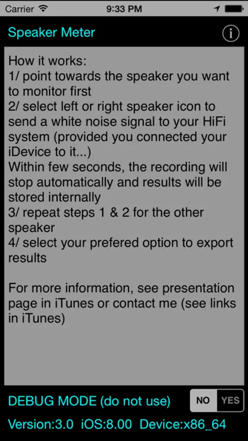 2/ select left or right speaker icon to send a white noise signal to your HiFi system (provided you connected your iDevice to it through a wired connection *)