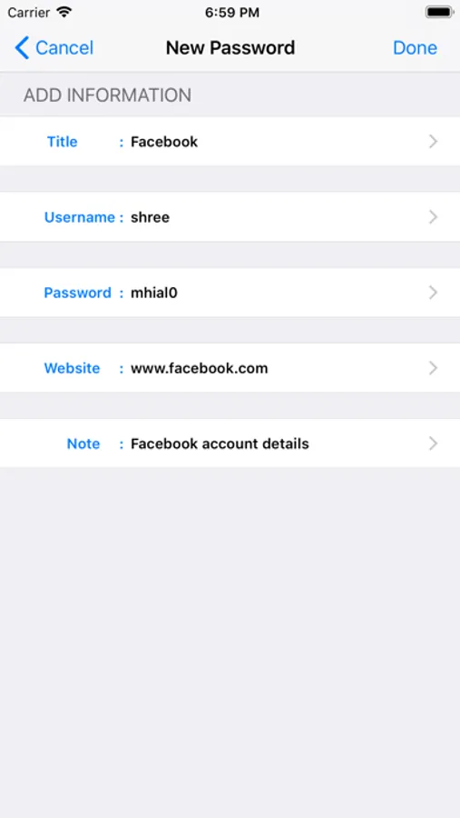 -Password details can be saved with website URL, title, username & password with description