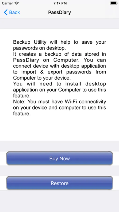 Backup Utility is available as an In App purchase just for $0.99 or price equivalent to your country’s currency. Please check http://passdiary.com to see the snapshots that will give you an idea as to how you can do this and get going.