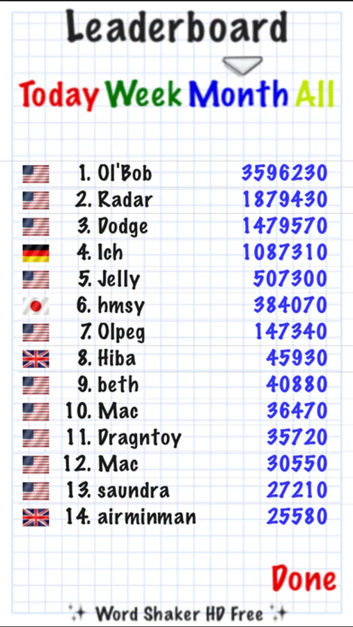 - online leaderboard with daily, weekly, monthly and all time scores.