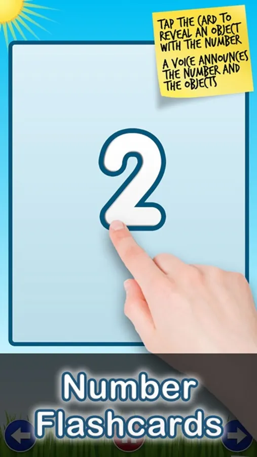 Each number is shown on a card. Tapping on the card flips it over to reveal an object while a voice announces the number and the objects. Use app settings to play in random order for a change of pace.