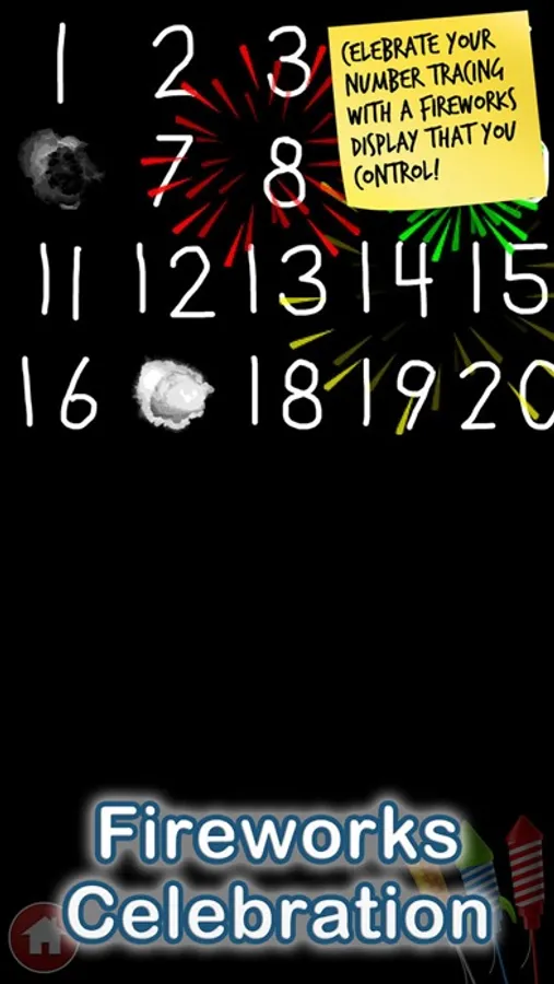 Each number is presented full screen with dotted lines shown to guide you through writing the number. As you trace with your finger, fun sounds play along the line. After each number is finished they are combined on a blackboard. You can play in random order by enabling them in the app settings. Complete all 20 numbers to unlock the fireworks celebration with exploding numbers and music!