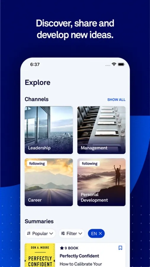 • Follow expert-curated channels in topics such as business, productivity, leadership, personal development, science & technology, and more