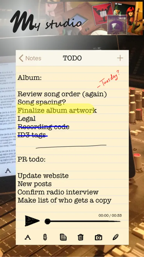 - Add audio to the page by recording with the built-in microphone (iPhone) or an external microphone (iPod touch). Continue to edit your note while recording.