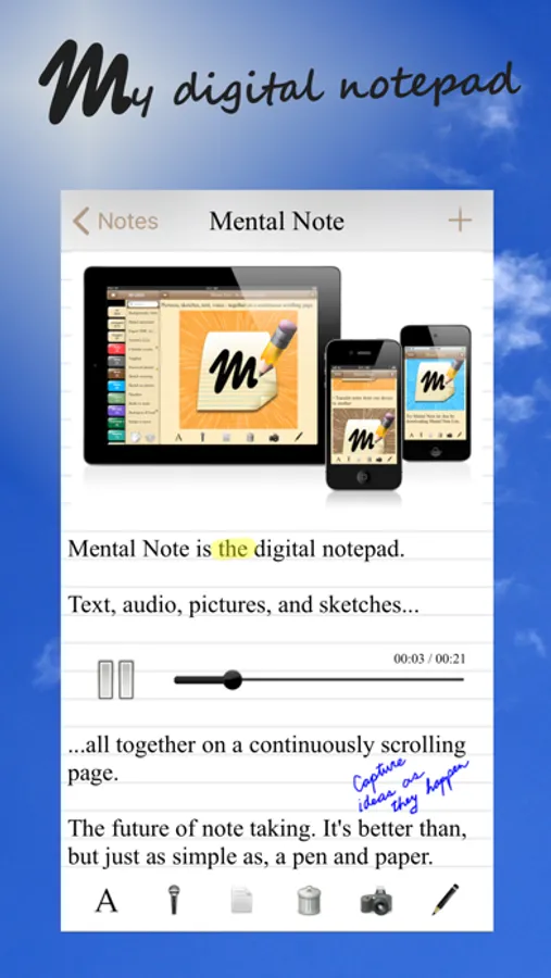 Mental Note allows you to capture ideas as they happen: use photographs, dictate, add text, sketch on anything. Ideas clarified. Creativity captured.