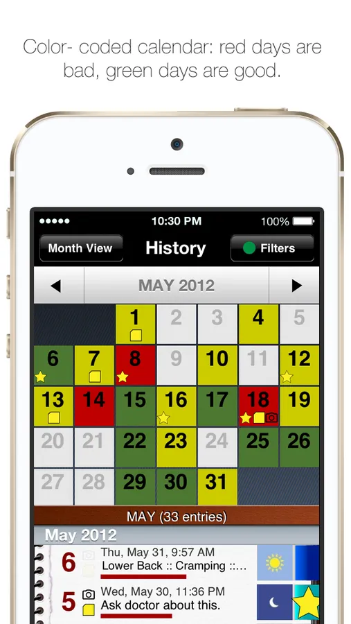 The interactive graph and color-coded calendar make it easy to spot patterns, trends, and correlations.