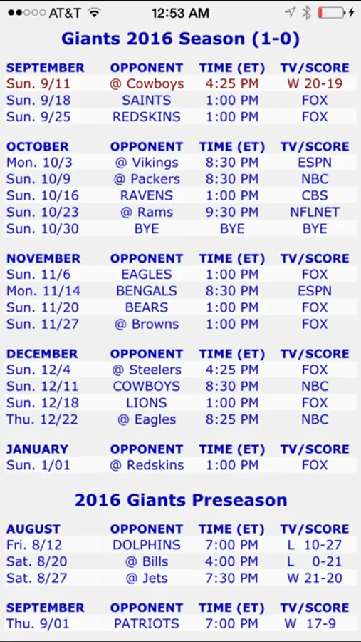 Go Giants! stores and displays the schedule and scores for the New York Giants football team. If internet access is available, the schedule is updated with the latest team scores. The schedule is displayed even when internet access is not available - perfect for non-cellular users.