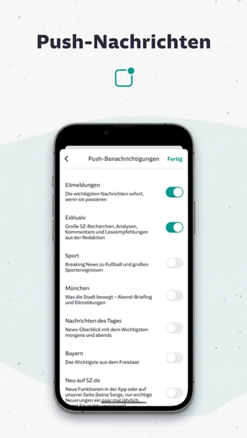 Eilmeldungen können Sie sich jederzeit als Push-Nachrichten auf Ihrem Gerät anzeigen lassen. Daneben informieren wir Sie über Exklusive-Texte, dem Neuesten aus den Bereichen Sport, Bayern und München sowie zwei Mal täglich mit den SZ Nachrichten des Tages. Diese Funktion können Sie bei Bedarf aber auch ganz einfach wieder deaktivieren.