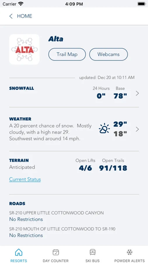 Everything you want to know before you head up hill is here. From road conditions to resort specific snowfall, 5-day forecasts, trail maps, webcams and lift and trail status.