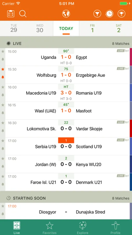 For a broad selection of countries, Futbol24 also offers livescore info on more than just the top division. Fans of football in England, for instance, can follow live action in 25 different competitions from the Premier League to the Women's Super League. To keep a good overview, simply select individual teams and competitions that you want to follow as favorites (e.g. Premier League, African Nations Cup, CAF Champions League, La Liga, Premier League Kenya and many more). These will then appear in your personal “favorites” section, which you can tailor to your needs. If you choose to follow the Kenyan Premier League for instance, your Futbol24 app will provide you with detailed live score info on all KPL fixtures.