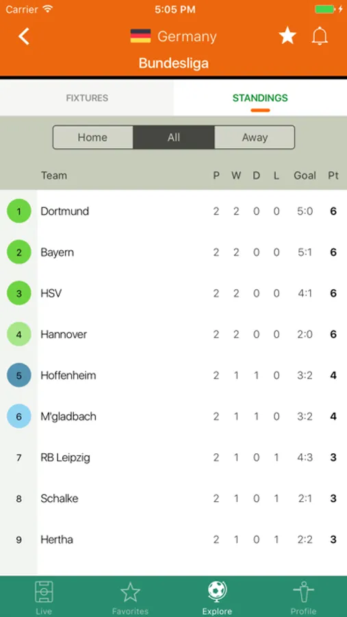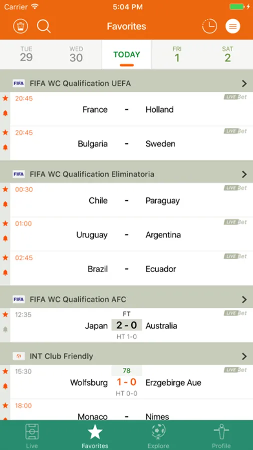 Select your favorite teams and leagues and receive a notification as soon as anything happens in a match with your team involved. To mark a fixture or a team, simply swipe right, and your selection will be added to your list of favorites. This way, you will always stay up to date about your favorite teams' performances, as you won't miss out on any goals, bookings or red cards.