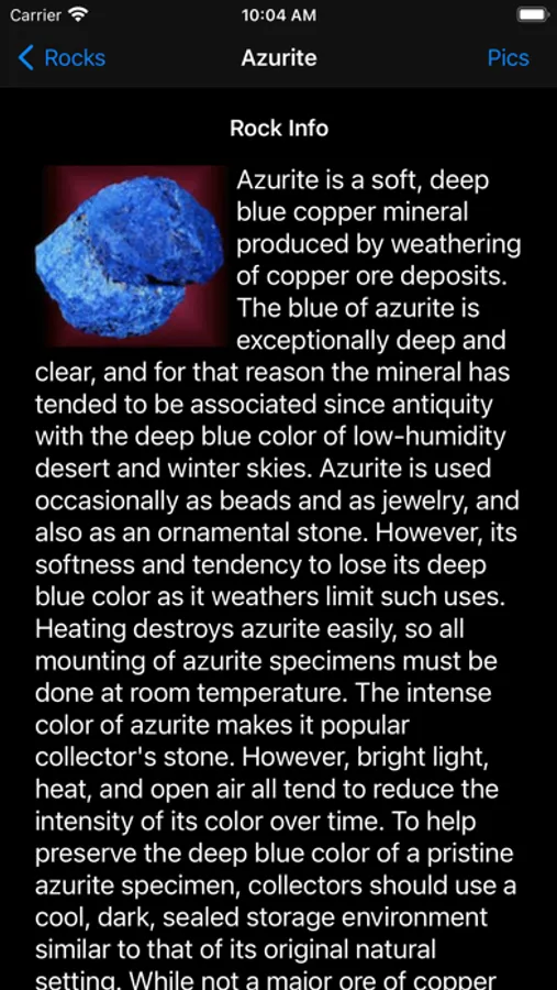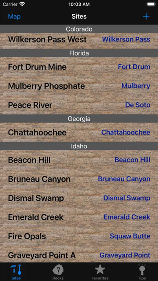 SITES - With over 160 sites, you can choose a site with the Map that also shows your location, or with the List which is separated by State. Each site has a description of the area and what you may find there. You can even add your own sites by plotting the GPS coordinates on the map. RockHound was not intended to be a complete guide to every site, they are mostly in the US. The power is in being able to add your own sites anywhere in the world.