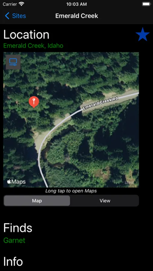 FAVORITES - You have the option to select sites as Favorite Sites. The Favorite Sites can have pictures attached to them that you import from your Photo Library or take with the Camera. That way you can keep track of what you find at each site. The power of Rockhound is in this section where you have complete control of the descriptions and pictures of any Site that you mark as a Favorite.