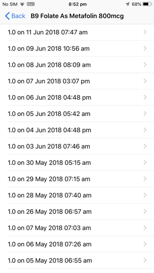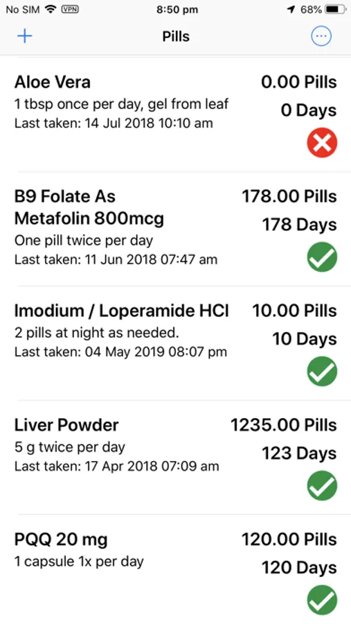 PillMinder allows you to easily track when you take a pill - simply tap the handy status indicator button next to each pill and it's recorded. The status indicator also shows you when you're due to take any of your pills by changing the button from a red x (indicating that it's too early) to a green check mark. What's more, the application keeps track of when you took a given pill and what your dosage was at that time. So you can always use the "History" button to go back and check what your dosage was over time and when your dosage changed.