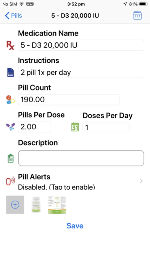 If you take more than one dose of a given pill for a given day, PillMinder can handle that too. Are your pill dosages not whole numbers? Not a problem! PillMinder will deal with that easily. PillMinder will also remind you when you need to take your pills next. And you can keep photos of your pill bottles and pills for each individual pill.