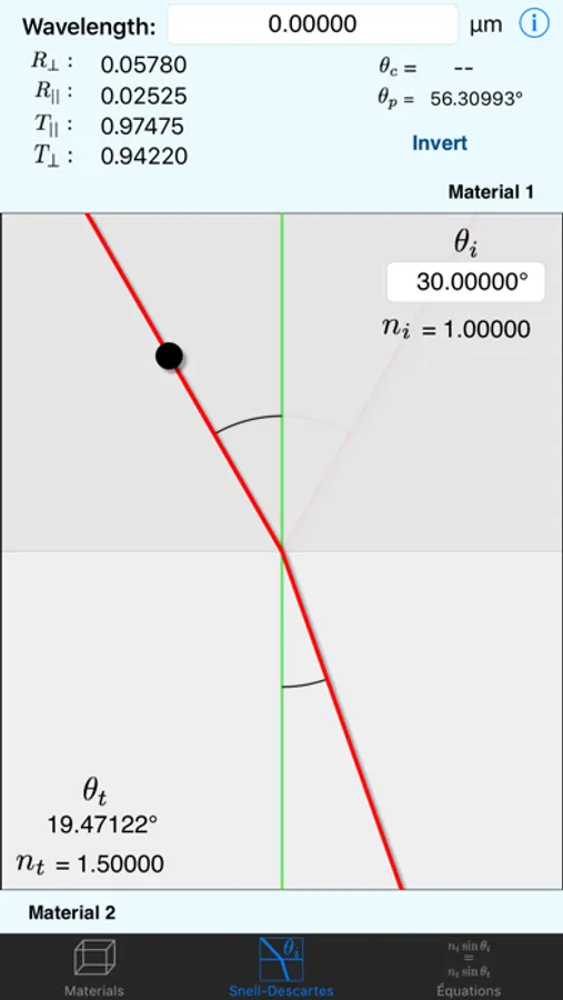 - Reflection and transmission coefficients for the two materials in accordance to the angle of incidence;