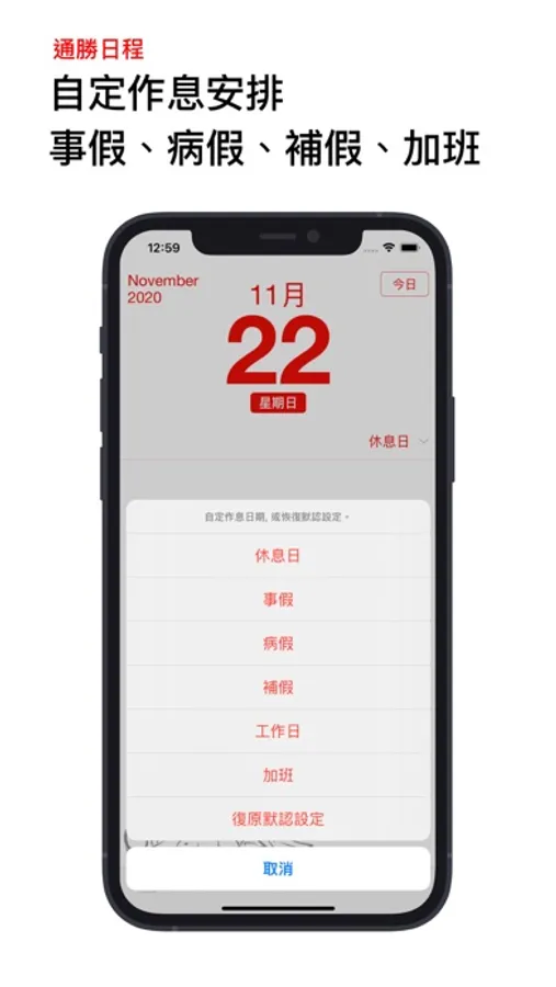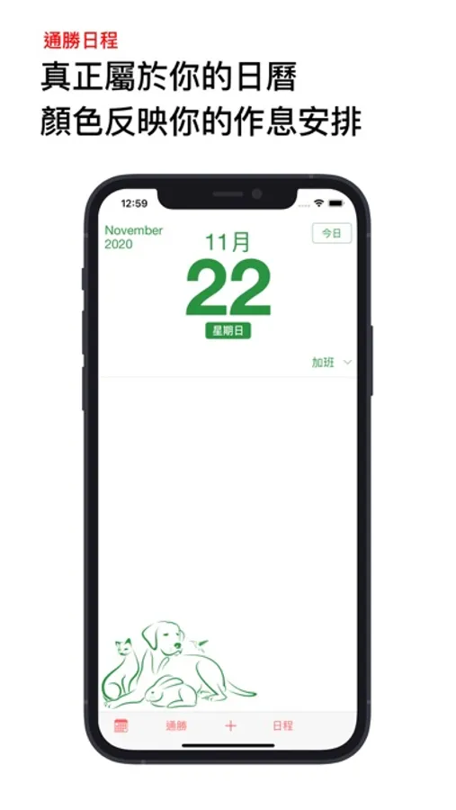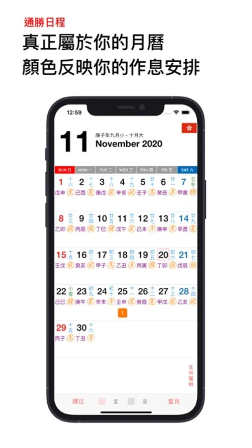 3. 通勝日程即時以傳統日曆風格更新日曆和月曆的顏色,來反映你的自定義作息安排。綠色代表工作日、紅色代表休息日/假日、藍色代表非工作日的週六等。