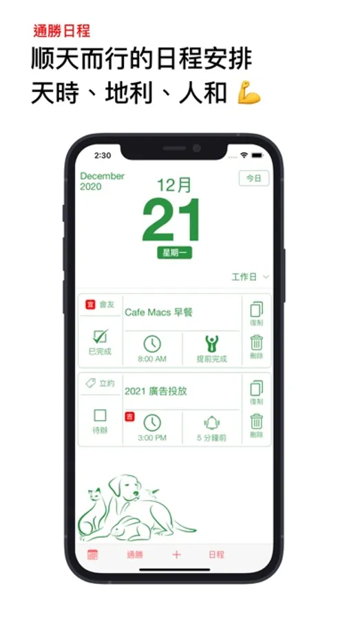2. 選擇待辦、巳取消、巳完成。通勝日程會自動記錄你的完成時刻和所花的時間。若你在預定開始執行時間之前巳辦妥該事項,通勝日程會標注該待辦事項為提前完成。