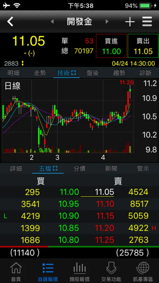 -技術線圖:支援5分鐘、60分鐘、日、周、月線圖,可觸控指標切換成交量、RSI、KD、MACD、PSY等技術指標,並切換橫置顯示。