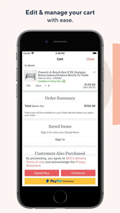 Mobile shopping has never been more simplified and fun. Now you can watch our TV channels live by simply downloading the updated QVC app on your iPhone. Get more of what you love with the QVC for iPhone® app that can be downloaded for free. The My Account feature lets you access more order information than ever. You can track your order, edit Easy Pay® options, and manage your address book. Plus, as always, you’ll never miss our Today's Special Value®—our best find of the day, an item we believe you’ll love. That goes for our QVC2 Big Deal™ and Beauty iQ Steal™, too!