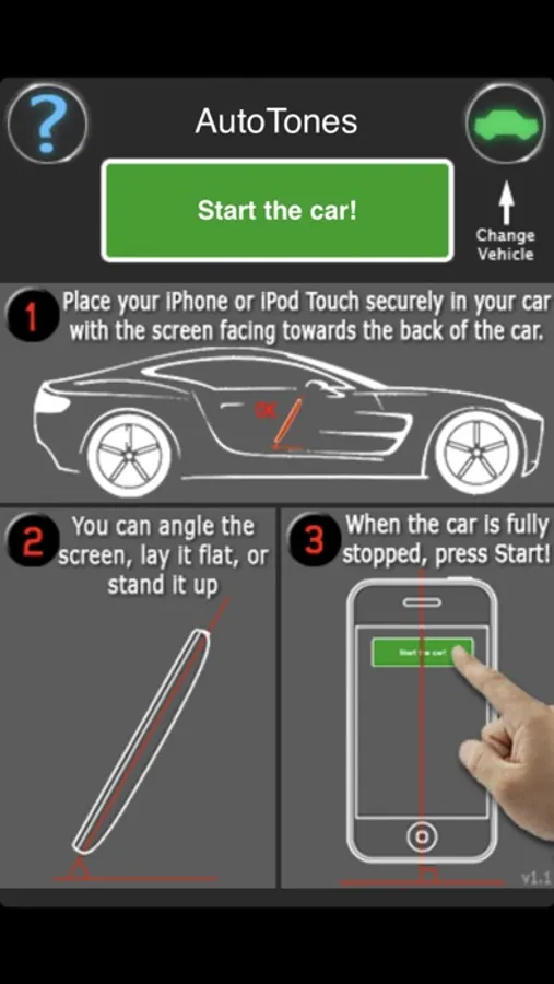 NOTE: For best results, plug your iPhone into your car stereo. Pressing the "Start the car!" button calibrates AutoTones™ to your device's current position. If your device is moved please make sure to re-calibrate AutoTones™ by pressing the red stop button and then press "Start the car!" again. Happy driving!