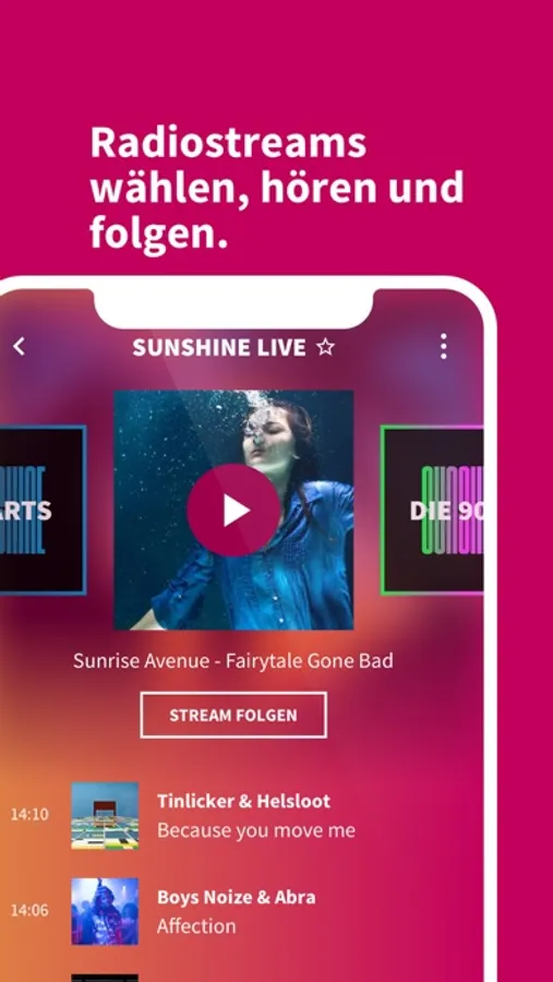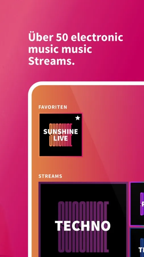 Mit der sunshine live-App bekommst du alles, was du von sunshine live kennst: den Radio-Live-Stream und alle weiteren Musikgenres und Festival-Sounds der elektronischen Musik: Von Chillout bis Hard. Von Trance bis Techno. Von Sets der Nature One bis zu den Tracks der angesagtesten Künstler auf dem Amsterdam Dance Event. Weit über 30 Channels warten auf dich. Und jetzt endlich: In einer auf einen Blick übersichtlichen Form und Struktur. Du willst den Klängen der Vergangenheit lauschen? Dann check die Channels unserer Zeitreise: 80er, 90er, Classics oder 90s Anthems. Dir ist nach Techno - jetzt findest du alles unter Techno & More: Techno, German Techno, Tech House oder die Sets der Time Warp. Dir ist nach Party & Hits - wir haben Sie. Genau wie harte Beats wie Hardstyle & Bunker-Techno. Alle Channels sind kostenfrei und in der App sofort verfügbar.