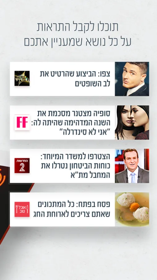 הישארו מעודכנים בכל רגע עם מבזקי חדשות 12, ידיעות מעולם הבידור, הספורט, הלייף סטייל והמוזיקה לצד תכניות קשת וערוצי תוכן נוספים.
