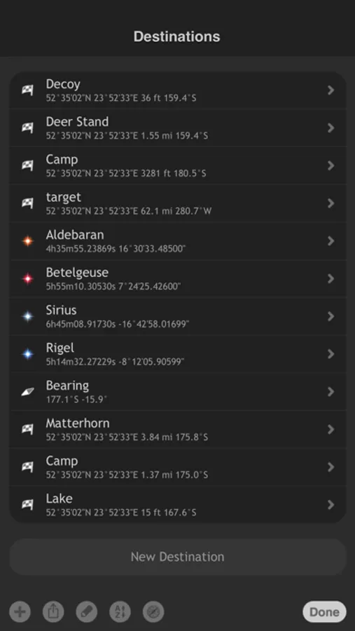 Save current position, add points from maps, manually enter location coordinates and bearings, add stars by hand or use a built-in star catalogue.