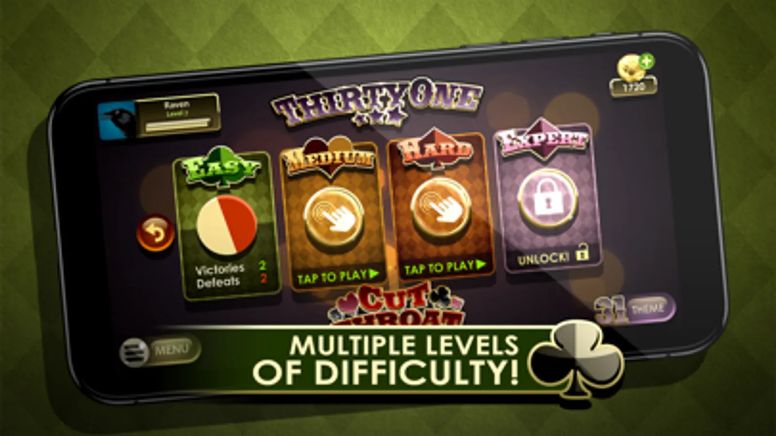 Thirty One offers four levels of difficulty, five unique game modes as well as extensive statistics tracking. It is an unparalleled game play experience! Also connect to Facebook to store your statistics and progress in the cloud. Personalize your game, earn experience with every game, and share your progress between all your devices.