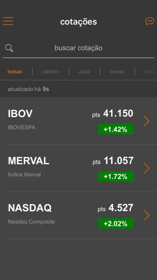 • Consulte cotações, maiores altas, baixas e volumes negociados do dia;