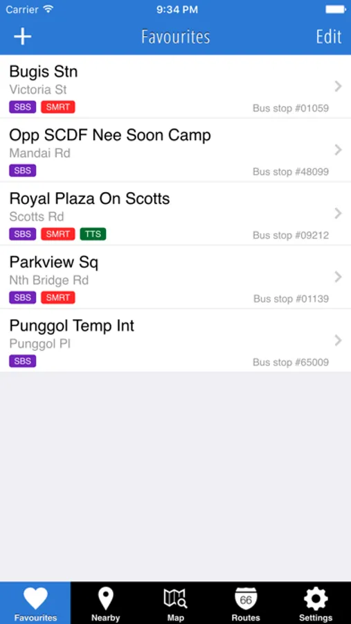 You can add bus stops to your favourites for easy access. To add a bus stop to your favourites, you can tap the "+" button on the favourites page, or tap the "fav" button on the prediction page of a selected bus stop. You can also enable auto-loading for individual bus routes at a favourite stop. When you open a favourite stop, all the routes marked as auto-loading will auto load the bus arrival times, and those routes are moved to the top of list.