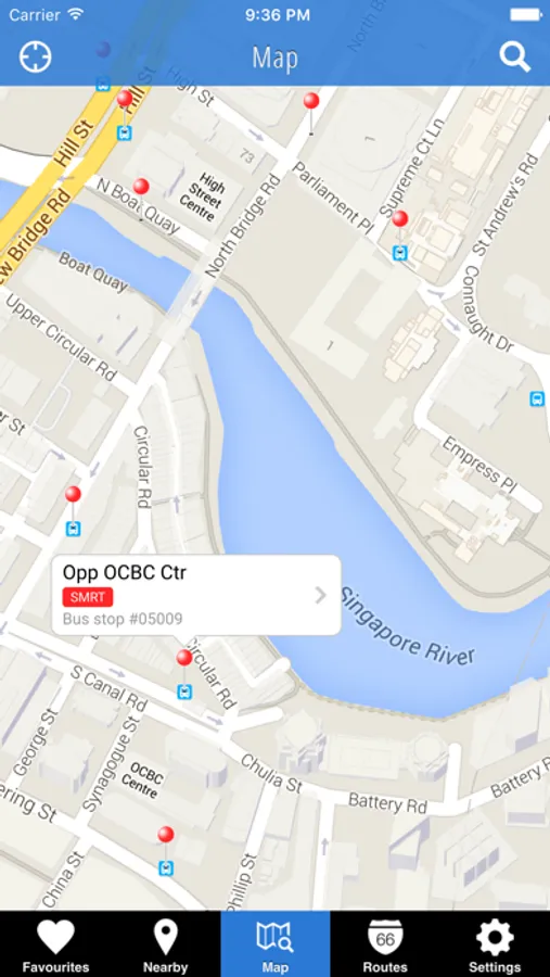 bus@sg shows you a list of bus stops near your current location, sorted by distance. You can tap the "locate" button next to the stop name to show it on the map.