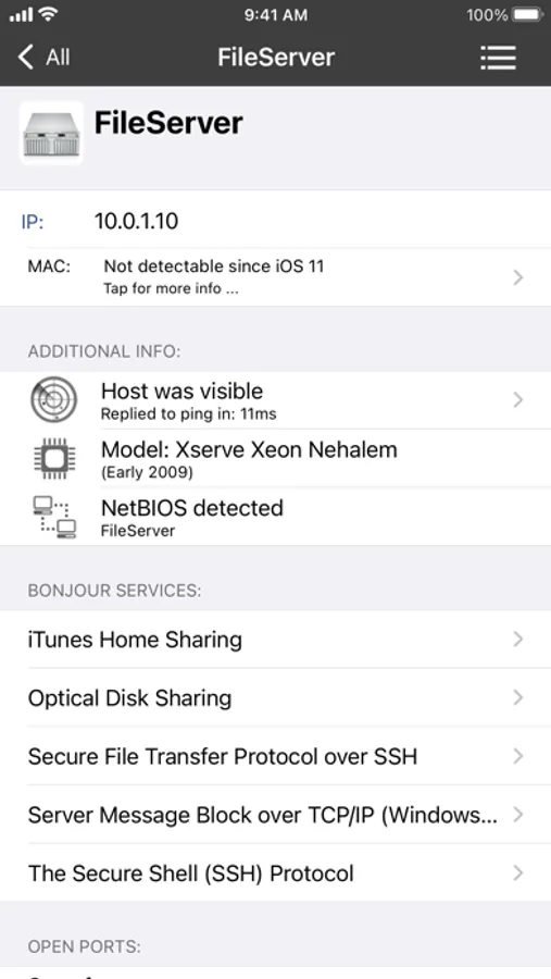 Applications on devices communicate with the outside world through so called TCP ports. iNet detects wether a port is open or closed. For all detected open ports the service using this port is displayed by its real name (if available).