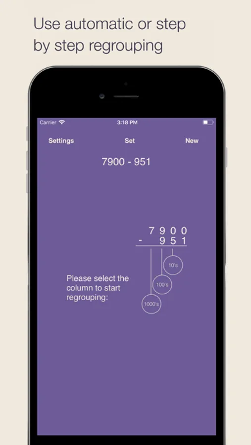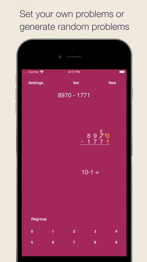 This math app can be used to teach and study the column subtraction method. The app is easy to use and it has an intuitive interactive interface with customizable colors and other settings. The user can solve random or custom subtraction problems with small and large numbers. The number of digits in the numbers can be set.