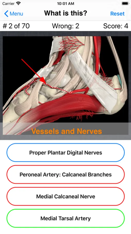 Each question has 4 possible answers. When you tap one of the answers, the default border color of the pressed button is changed to green (when it was the right answer) or to red (wrong answer). You have 3 attempts to give right answer. If you give it at the first attempt you will receive 3 points, at the second attempt - 2 points, at the third - 1 point. Play the "Anatomy Foot Quiz" quiz now to test and improve your knowledge of the human anatomy!