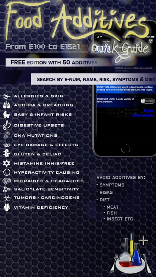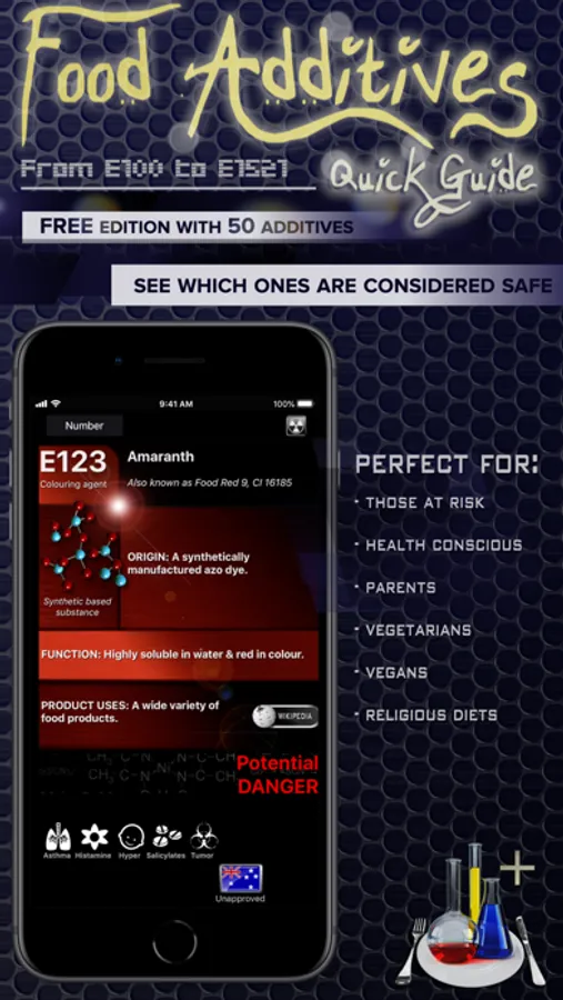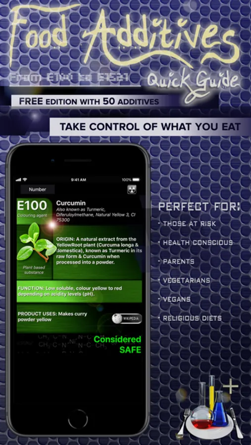 This application lets you quickly & easily access the general information of up to 450+ food additives (self contained database, so no internet connection needed!) PLEASE NOTE: This free version has only 50 additives, so you can see what it is like before committing to buying the full version via an in-app purchase.
