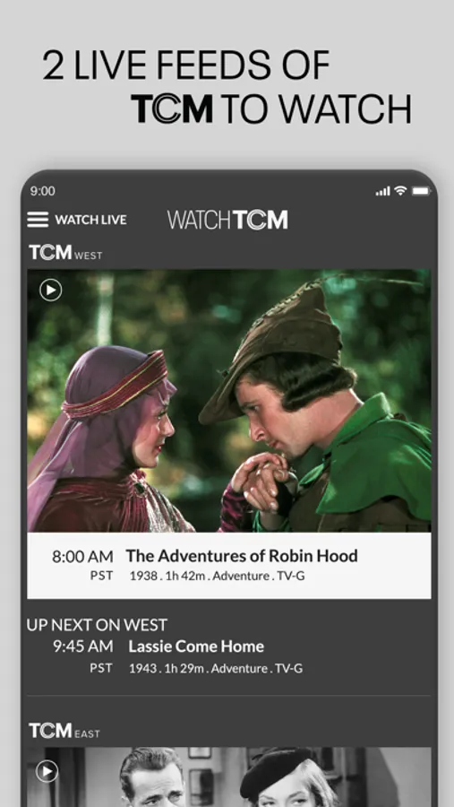 TWO LIVE STREAMS: Enjoy both an East and West Coast feed of Turner Classic Movies. Watch 2 different movies LIVE at any time, always UNCUT and COMMERCIAL FREE.